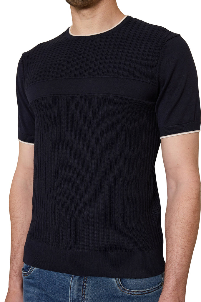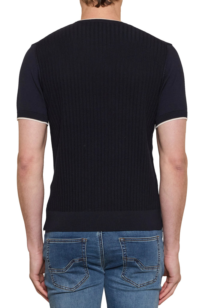The Ned Fancy Stitch Knit Tee features refined stitch detailing that adds subtle depth to a clean, modern silhouette. Finished with contrast trim at the neck and sleeves, it delivers an elevated take on an everyday basic. A versatile piece that transitions effortlessly from casual to polished dressing in a lightweight cotton.