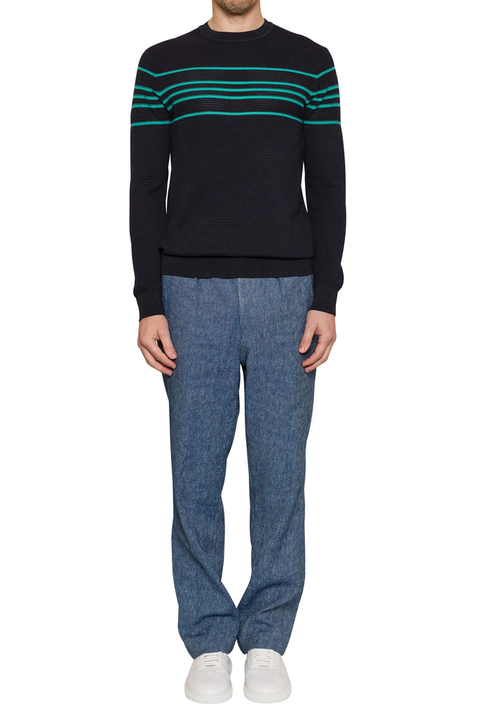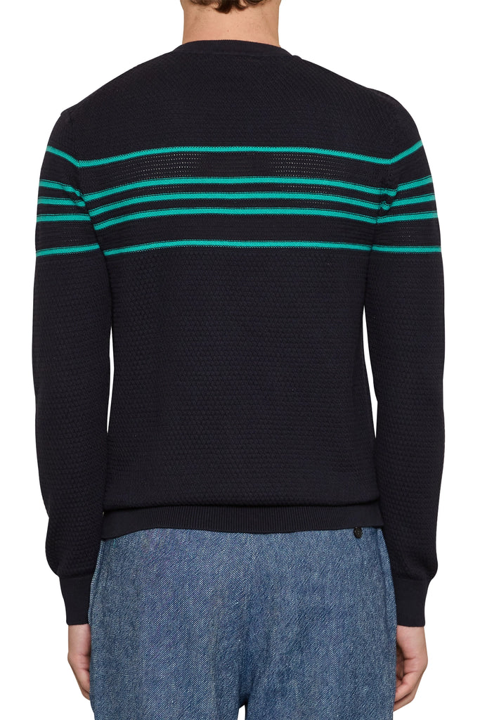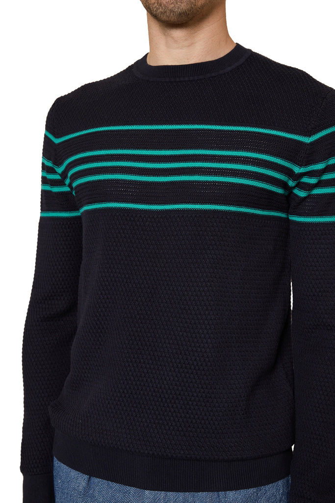 The Tom Basket Knit Crew features a long-sleeve silhouette and a classic crew neckline, highlighted by refined stripe detailing across the chest and sleeves. Knitted from 100% cotton, its textured basket weave structure adds subtle depth while maintaining a lightweight, breathable feel. A polished update to an everyday essential that pairs effortlessly with both casual and tailored looks.