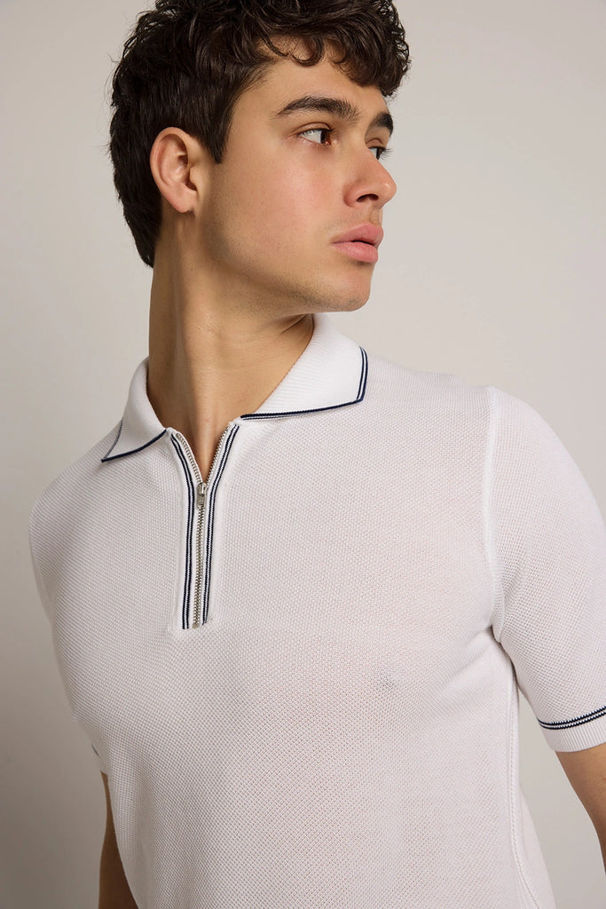 Spencer Contrast Stripe Zip Polo in White/Ink