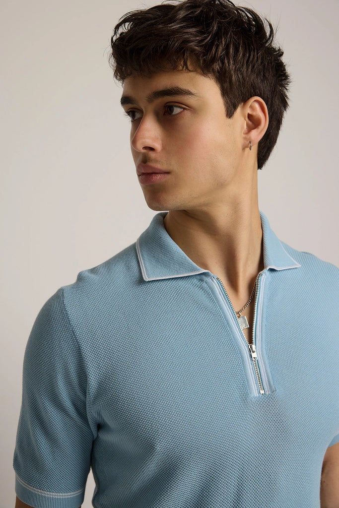 Spencer Contrast Stripe Zip Polo in Sky/White