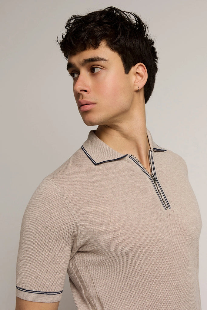 Spencer Contrast Stripe Zip Polo in Natural/Ink