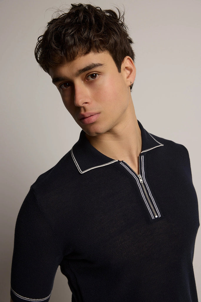 Spencer Contrast Stripe Zip Polo in Navy/White