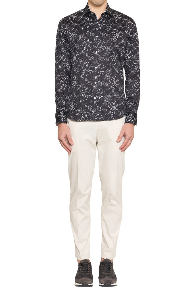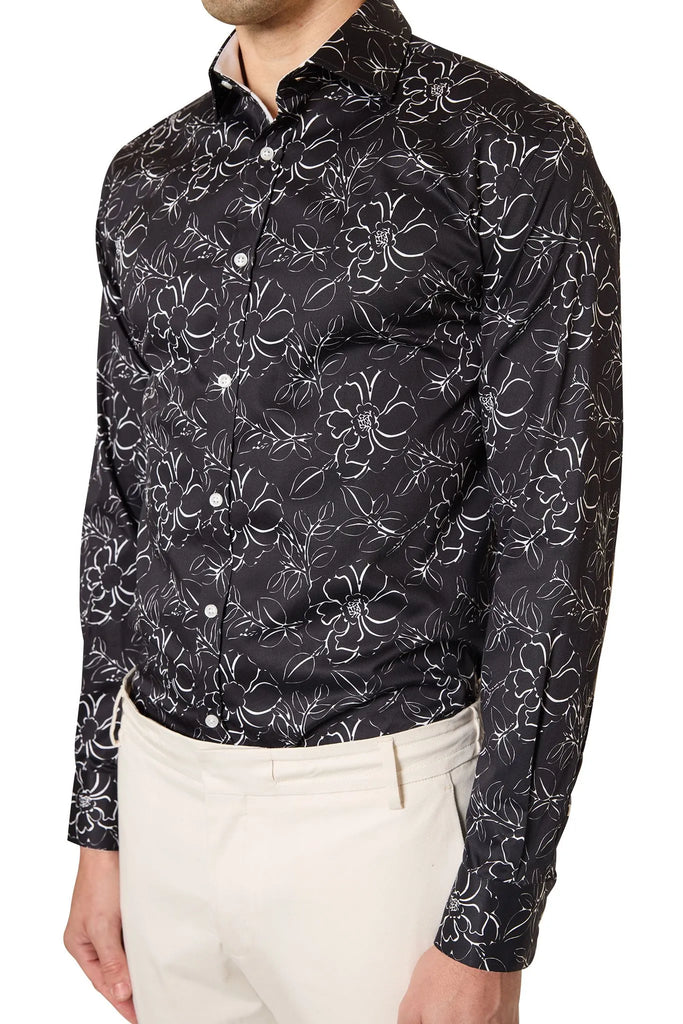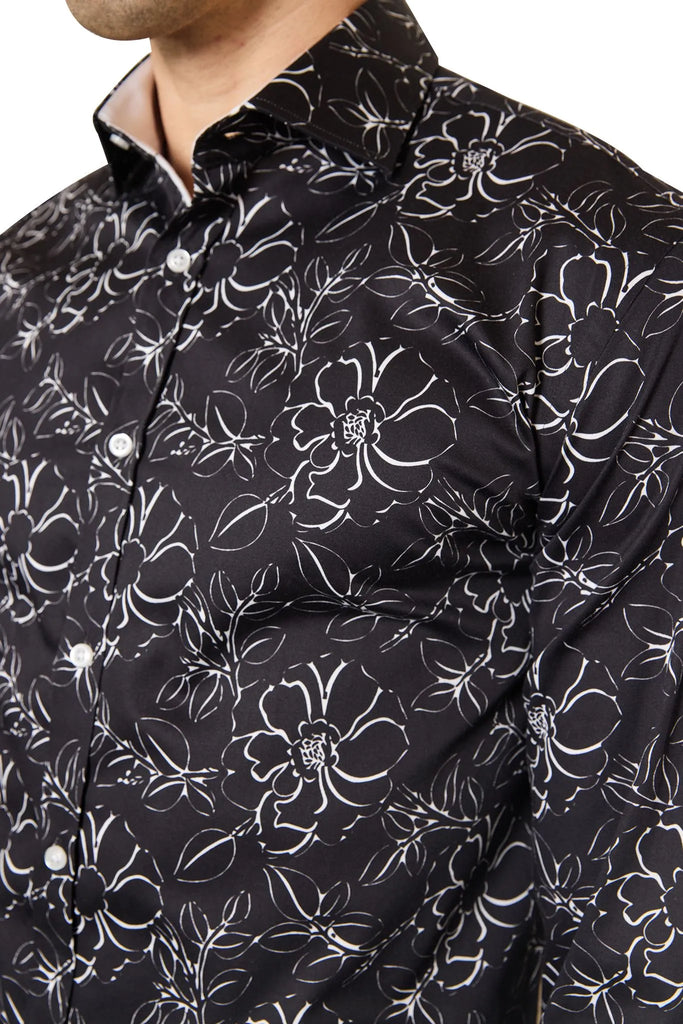 The Claude Flower Printed Shirt in Black is a bold yet sophisticated statement piece. Crafted from high-quality fabric, it features a striking floral print on a black background, adding a touch of unexpected flair to your wardrobe.  Its contemporary cut ensures a comfortable and flattering fit, perfect for both casual outings and dressier occasions. The Claude shirt is a unique piece that allows you to express your individuality with confidence.