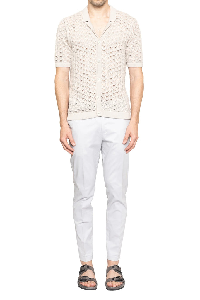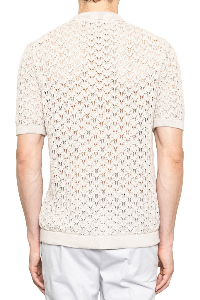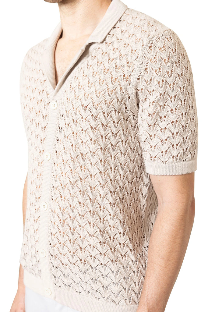 The Eric Knitted Lace Cuban Shirt Cuban Shirt is your ticket to effortless warm-weather style. Made from 100% cotton with an open mesh knit, this shirt offers ultimate breathability and comfort during the spring and summer months.  The Cuban collar adds a touch of retro cool, making it perfect for relaxed days at the beach or evenings out with friends. Pair it with your favorite shorts or lightweight trousers for a casual look that's both stylish and comfortable.