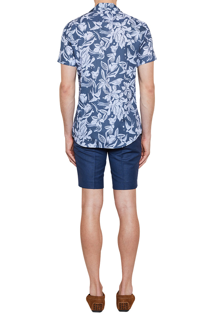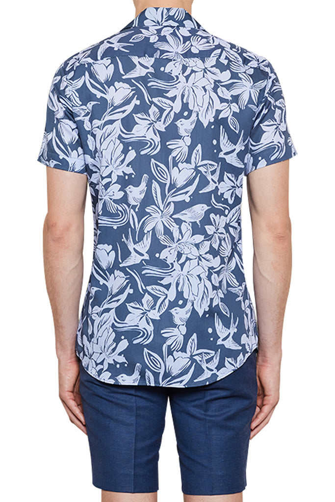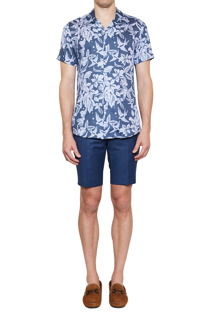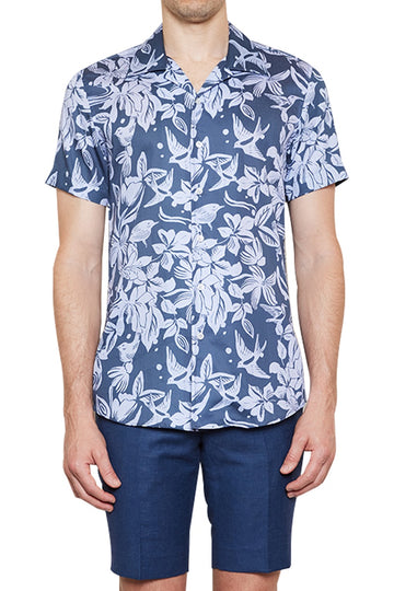Marcello Tropical Print Cuban Shirt in Navy/Sky