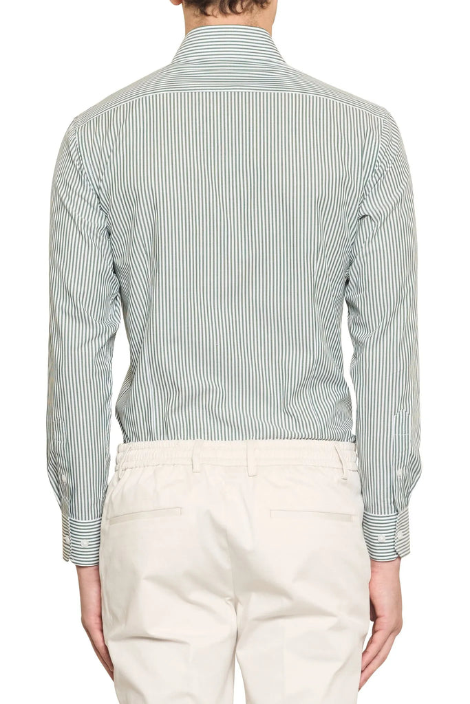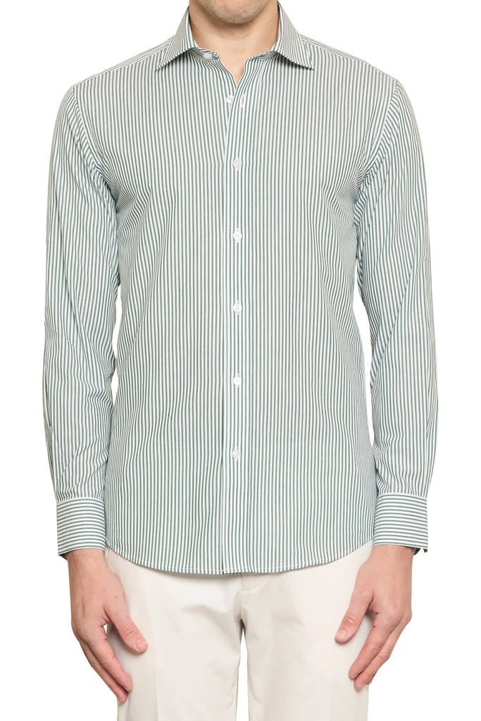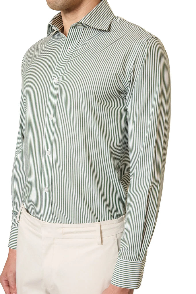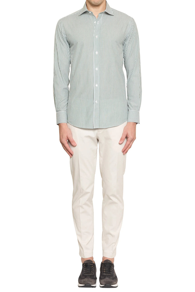 The Nelson Striped Shirt in White/Forest offers a fresh take on a classic pattern. Crafted from luxurious 100% cotton Italian fabric, this fashion-forward shirt features crisp white and deep forest green stripes, creating a bold yet sophisticated look. The premium Italian cotton ensures superior comfort and breathability, while the striking colour combination adds a touch of modern flair.  Elevate your everyday style with the Nelson Striped Shirt, a versatile piece that effortlessly transitions from day to night.
