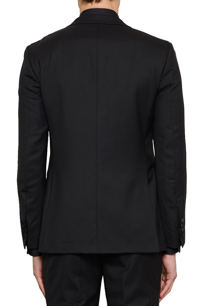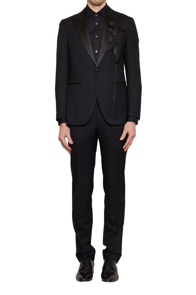 Crafted from the finest Italian wool, the Guy Applique Tuxedo Jacket is a masterpiece of modern tailoring. This exquisite jacket features a unique flower appliqué, adding a touch of artful flair to its classic silhouette.  The luxurious fabric drapes impeccably, ensuring a comfortable and flattering fit for any formal occasion. With its refined design and superior craftsmanship, the Guy Applique Tuxedo Jacket is the perfect choice for the discerning gentleman who appreciates both style and substance.